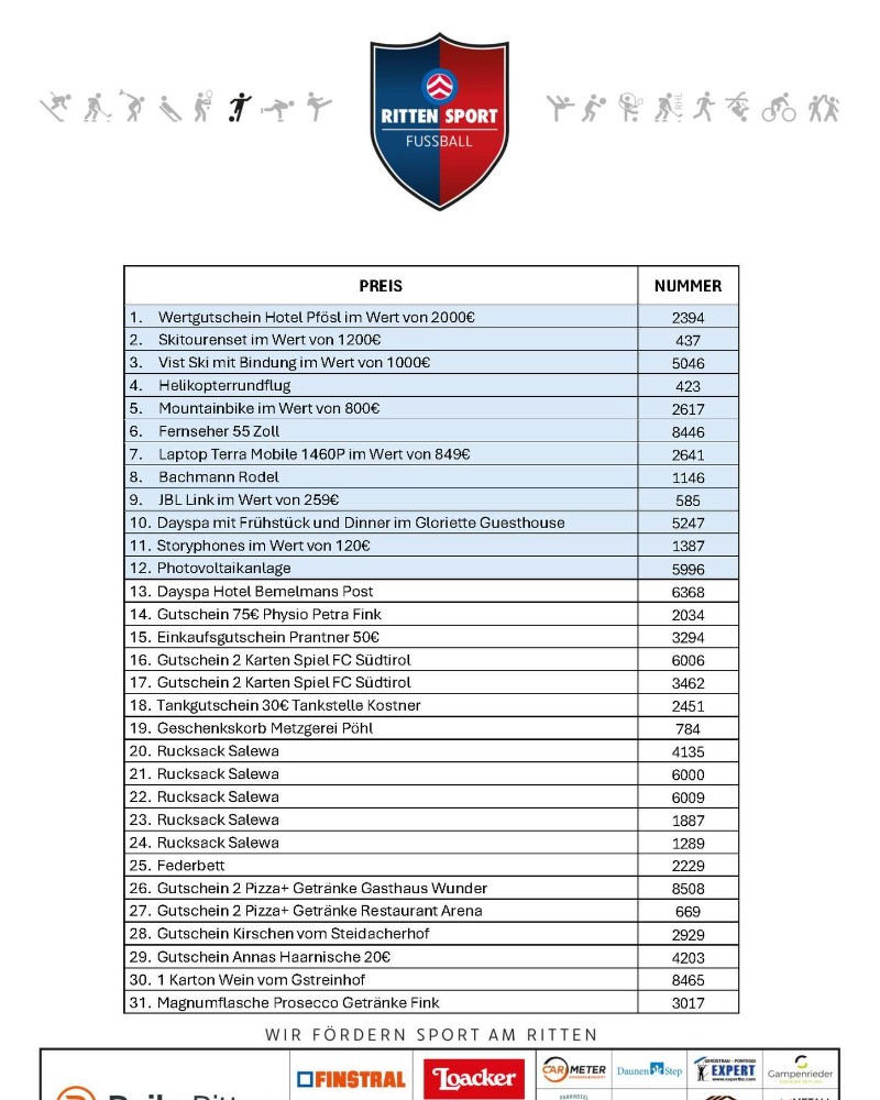 Die Treffer müssen bis spätestens 18.06 nach Vereinbarung (Tel. 349 - 4668532 ) im Fuball Büro - Ritten Arena abgeholt werden.