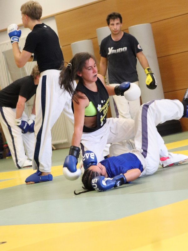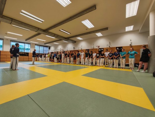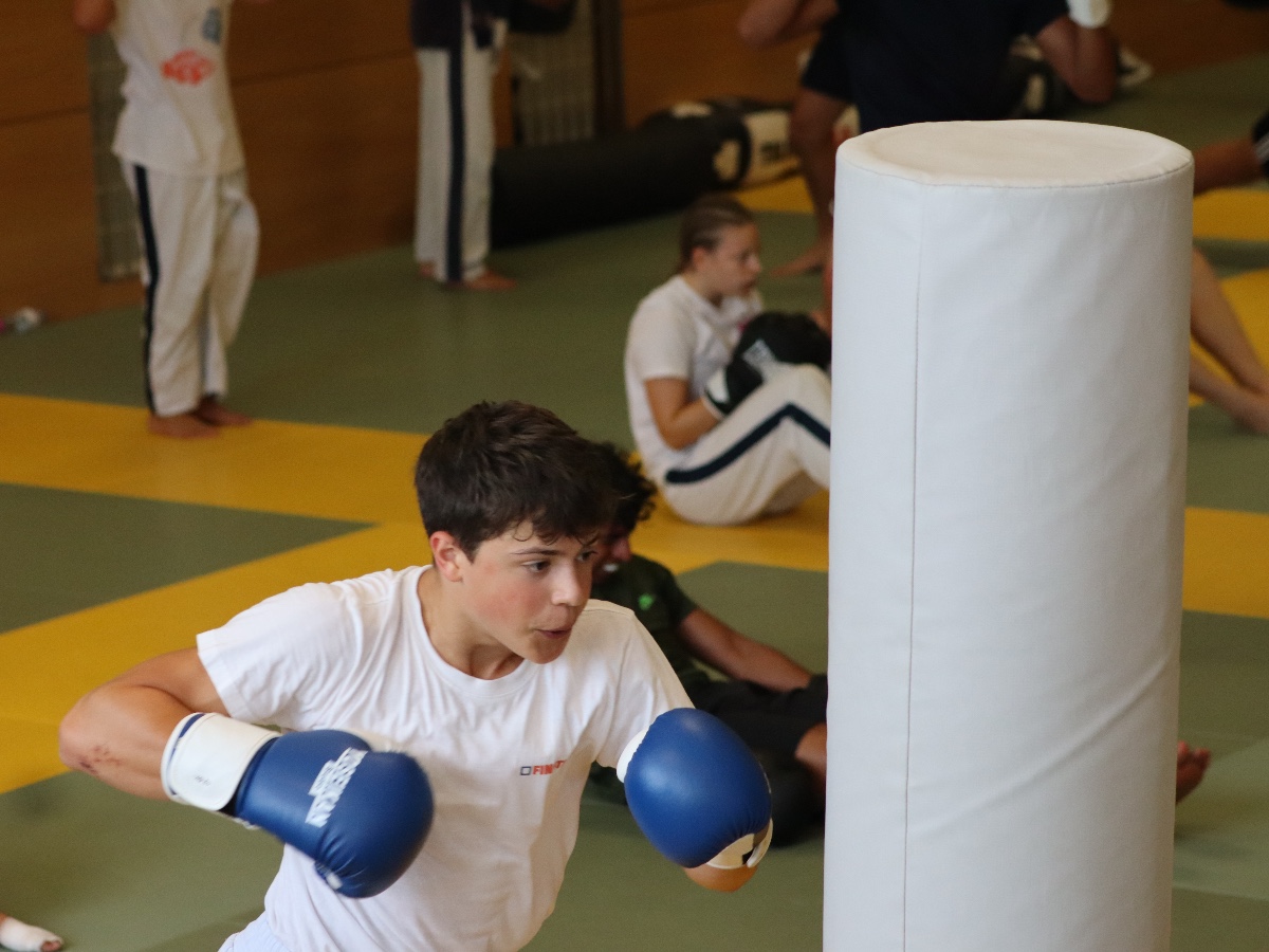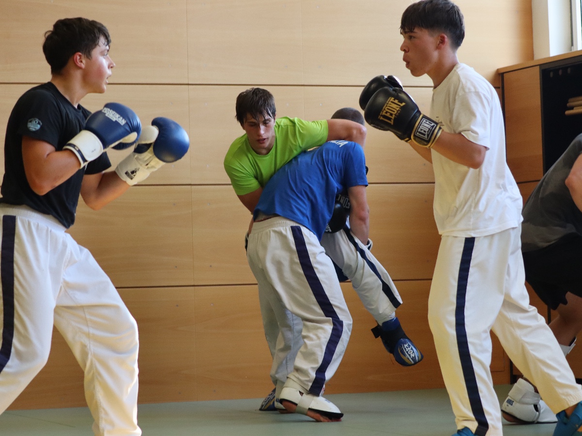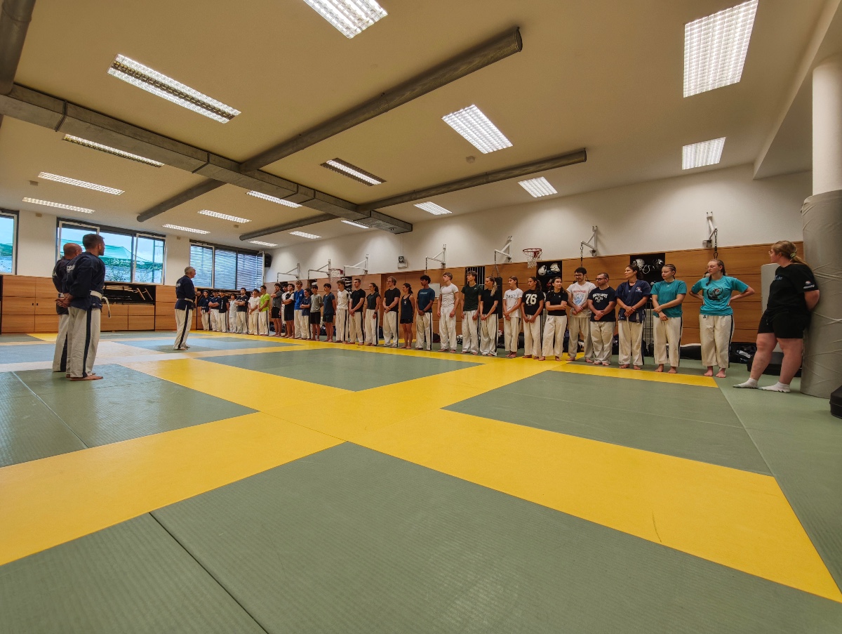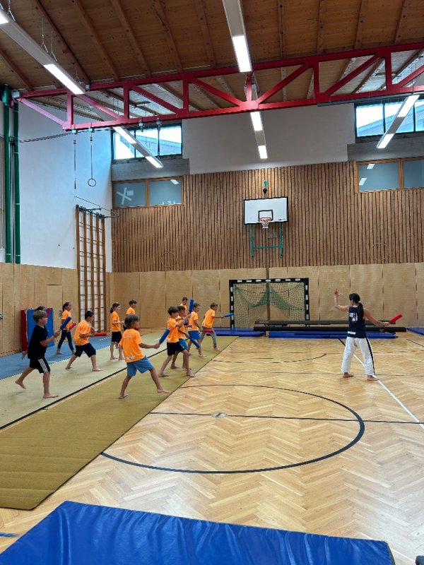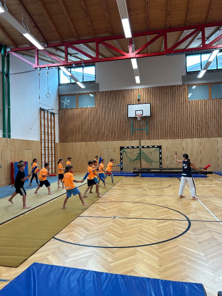 Besonders am Herzen liegen uns auch die Kinder-Sommerwochen, bei denen wir den Kleinen einen spannenden Einblick in unsere Sportart geben konnten. Dabei stand das Thema Selbstverteidigung im Mittelpunkt: Die Kinder lernten, wie man richtig fällt, sich schützt und mit einfachen Bewegungen aus brenzligen Situationen befreien kann. Auch erste Tritte und Schläge – natürlich ganz spielerisch und sicher – durften ausprobiert werden. Besonders aufregend war für viele das Üben mit einer weichen Übungswaffe.
